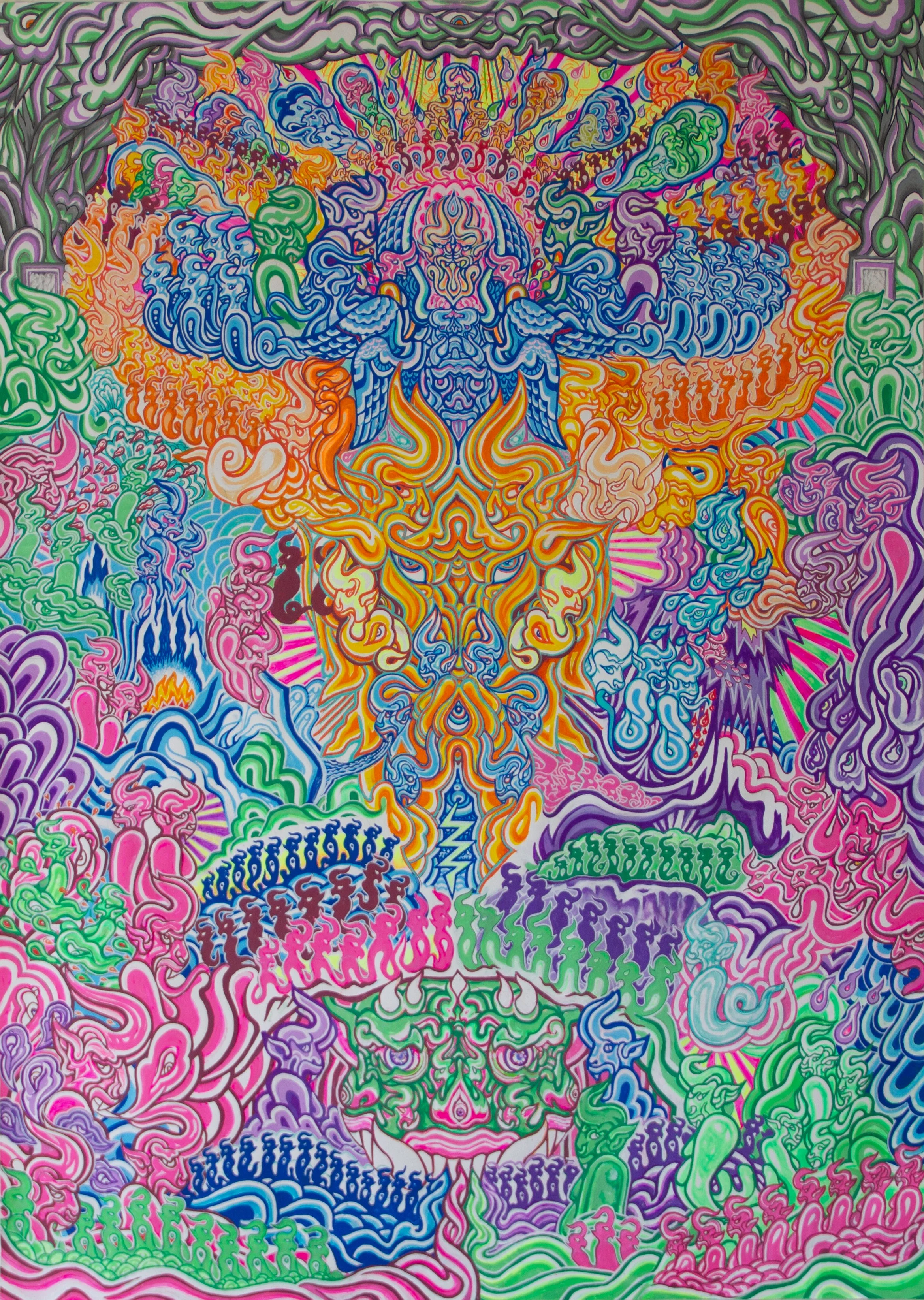 Barry William Hale, a globally renowned occult artist, conjures art from otherworldly realms by bridging the gap between the conscious and unconscious. His monumental automatic drawing on aluminium sheets taps into the State Collection’s rare books on ancient magic and Surrealist texts.